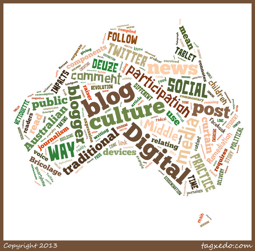 Examples of news and political blogs abound in the Australian context. In late 2011, Greg Jericho, the author of the Rise of the Fifth Estate and pro blogger at Grog’s Gamut, compiled this list of Australian political blogs. The 2013 winner of the Best Australian Blogs competition in the commentary section was AusVotes 2013, a compilation blog. Clearly, Australians who are not journalists are participating in political commentary by running and contributing to blogs. However, far from replacing traditional media sources, they act as a supplement to it. Would these bloggers or blogs have survived this long if traditional media sources were giving the public all they want in news delivery? They lend another voice to the debate, sometimes that voice is objective, sometimes not, sometimes that voice is in pursuit of a personal agenda, sometimes not. An Internet connection, a point of view and some very basic technical skill is all that participation requires.