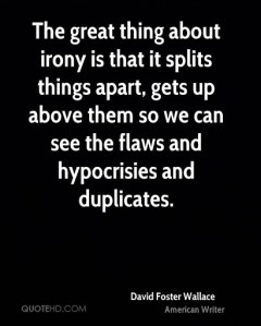So how can irony help? Well, it always pays to have a sense of humour in embarking on any change initiative. But beyond that is this notion of being enthusiastic whilst maintaining a healthy distance and not being too caught up in the imperfect outcomes of the change process or a step in it, and being able to accept and communicate the ironies of change to the right audience at the right time to the right level. In other words, as David Forster Wallace points out it is the ability to see and use the flaws, the hypocrisies and duplicates and not rally against them. This is part of the Ironic Performance.
